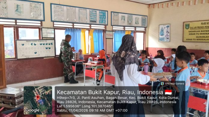 DUMAI,Suryapublik.com-Sebagai bentuk dukungan terhadap program peningkatan gizi pelajar, Babinsa Kelurahan Bagan Besar Koramil 02/BK, Sertu Sareh melaksanakan pendampingan kegiatan pembagian makanan bergizi gratis di sejumlah sekolah di Kota Dumai.