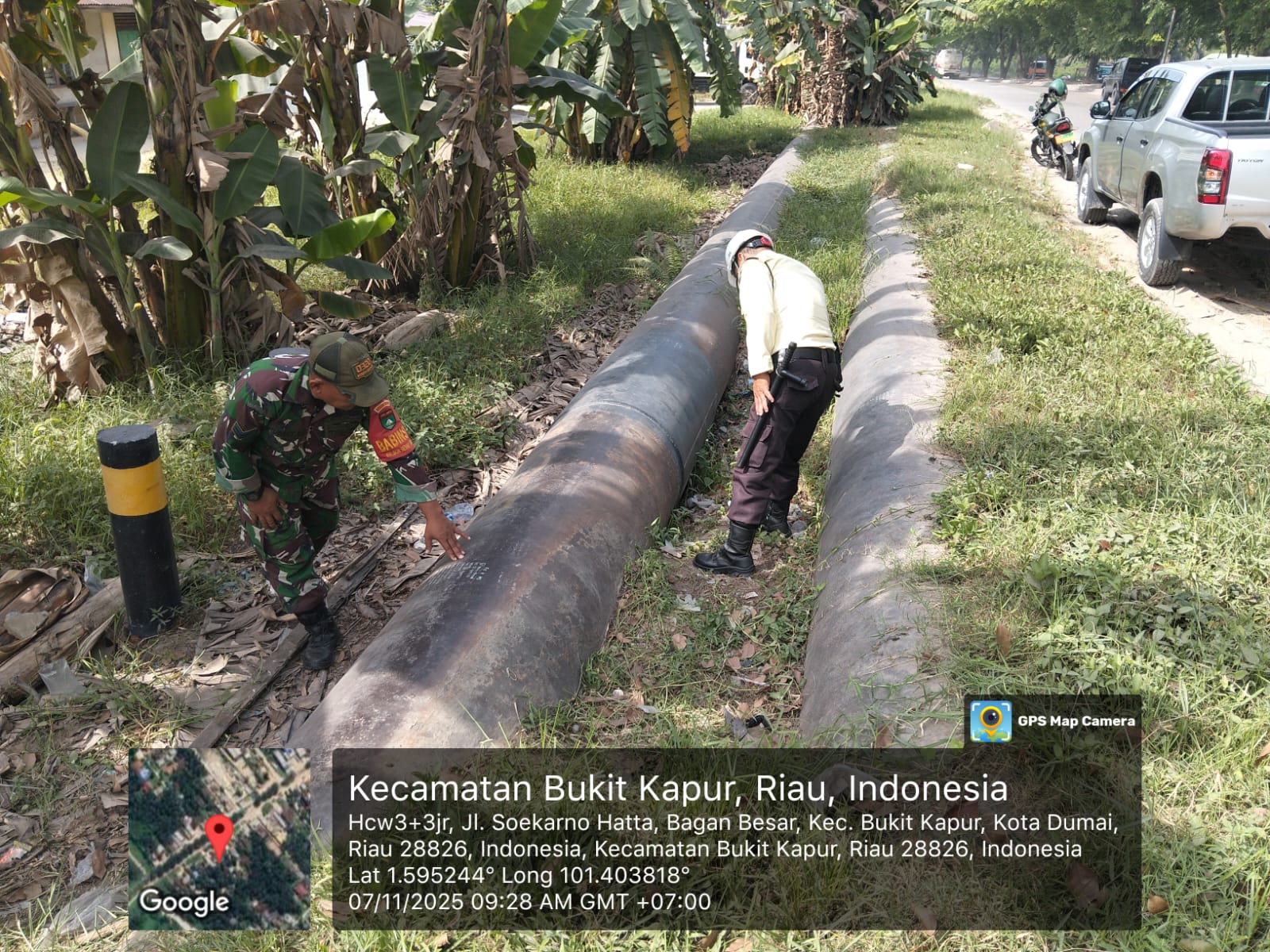 DUMAI,Suryapublik.com-Untuk memastikan keamanan dan kelancaran distribusi energi nasional, Tim Patroli SKK Migas Koramil 02/BK bersama Security PT Pertamina Hulu Rokan (PHR) melaksanakan patroli pengamanan di sepanjang jalur pipa minyak wilayah Kecamatan Bukit Kapur, Kota Dumai, Jumat (7/11/2025). Kegiatan yang berlangsung selama delapan jam ini juga disertai sosialisasi kepada masyarakat agar tidak melakukan aktivitas di area zona pipa.