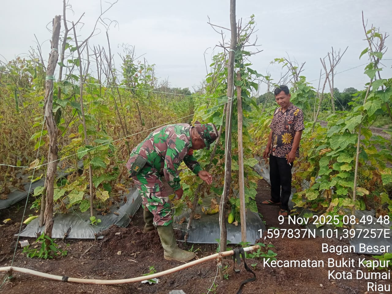 DUMAI, Suryapublik.com-Wujud kepedulian terhadap ketahanan pangan terus ditunjukkan Babinsa Kelurahan Bagan Besar, Koramil 02/BK Kodim 0320/Dumai. Pada Minggu (9/11/2025), Sertu Sareh turun langsung ke ladang milik Julianto di Jalan BTN Koperasi RT 05, Kelurahan Bagan Besar, Kecamatan Bukit Kapur, untuk melaksanakan pendampingan karya nyata pada tanaman mentimun.