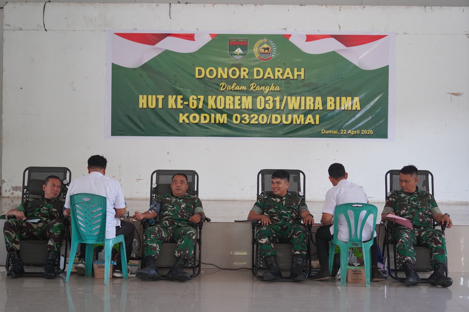 DUMAI,Suryapublik.Com-Dalam rangka memperingati HUT ke-67 Korem 031/Wira Bima, Kodim 0320/Dumai menggelar kegiatan donor darah yang berlangsung di Aula Sudirman Kodim 0320/Dumai, Jalan S.S Kasim, Kelurahan Teluk Binjai, Kecamatan Dumai Timur, Rabu (22/04/2026).