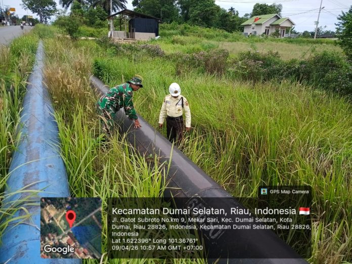 Patroli melibatkan personel Koramil 01/Dumai, Serda K.J. Saragih, bersama security PT PHR dengan fokus pada pengecekan jalur pipa minyak sebagai objek vital nasional.